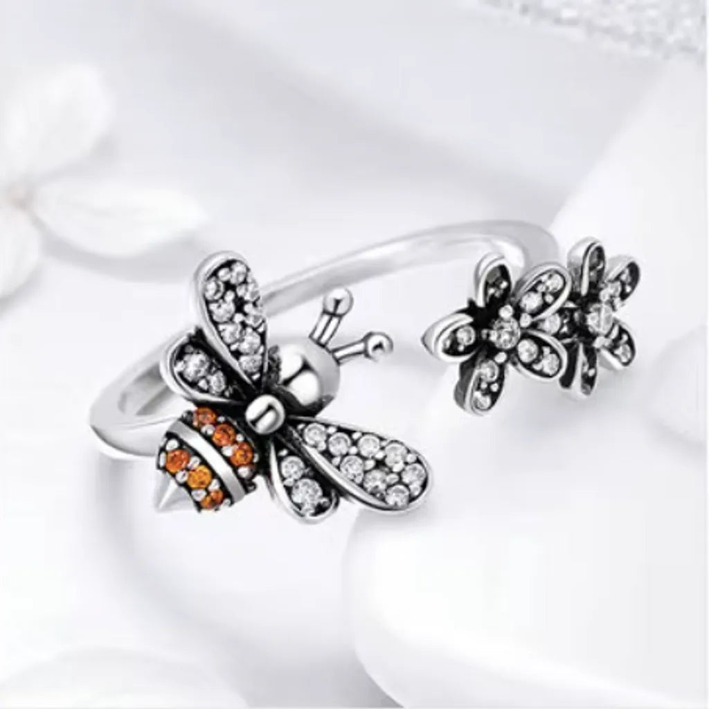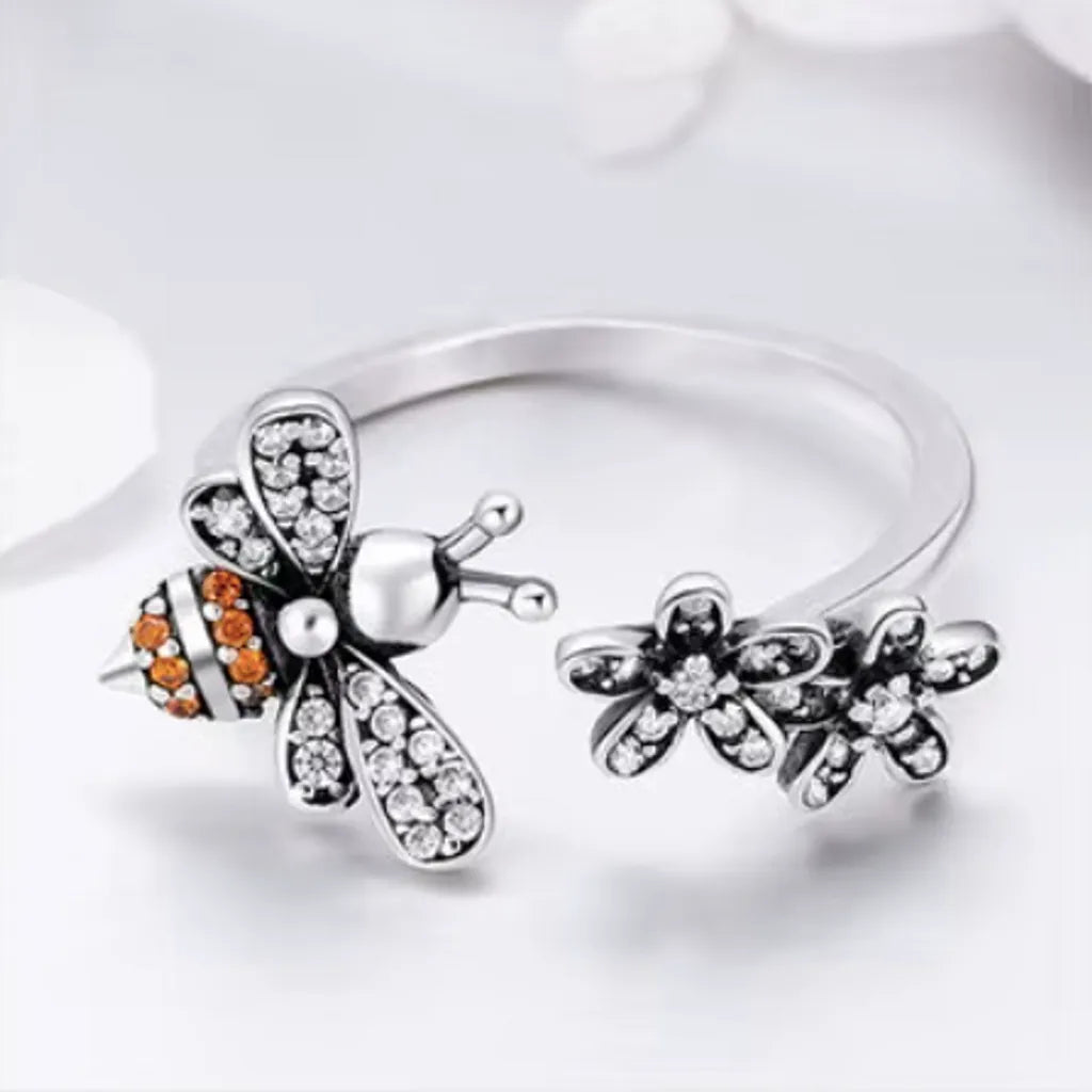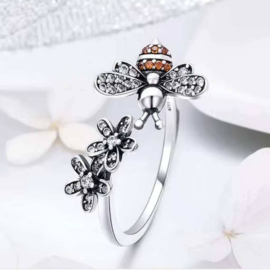 Bague abeille et fleurs belles de nuit en argent 925 portée sur une main féminine, dévoilant son design raffiné et ses zircones scintillantes.