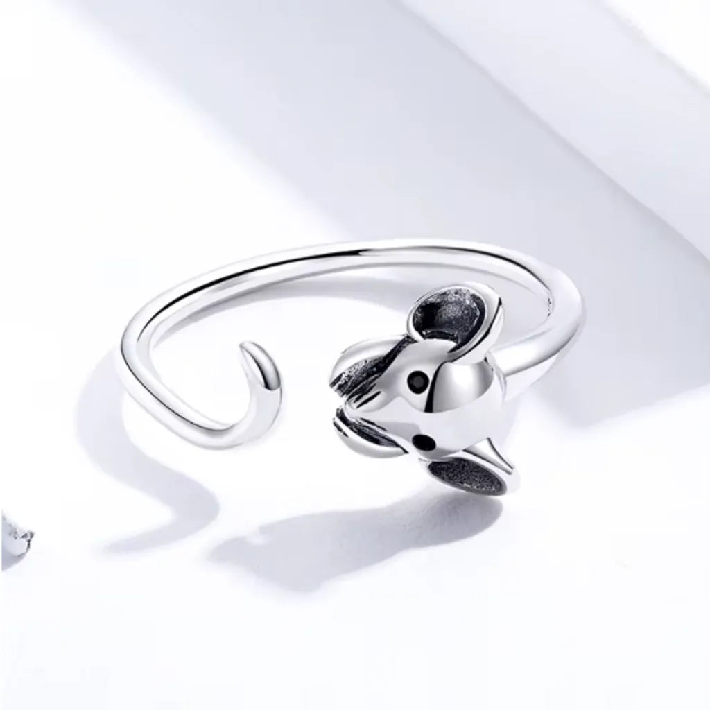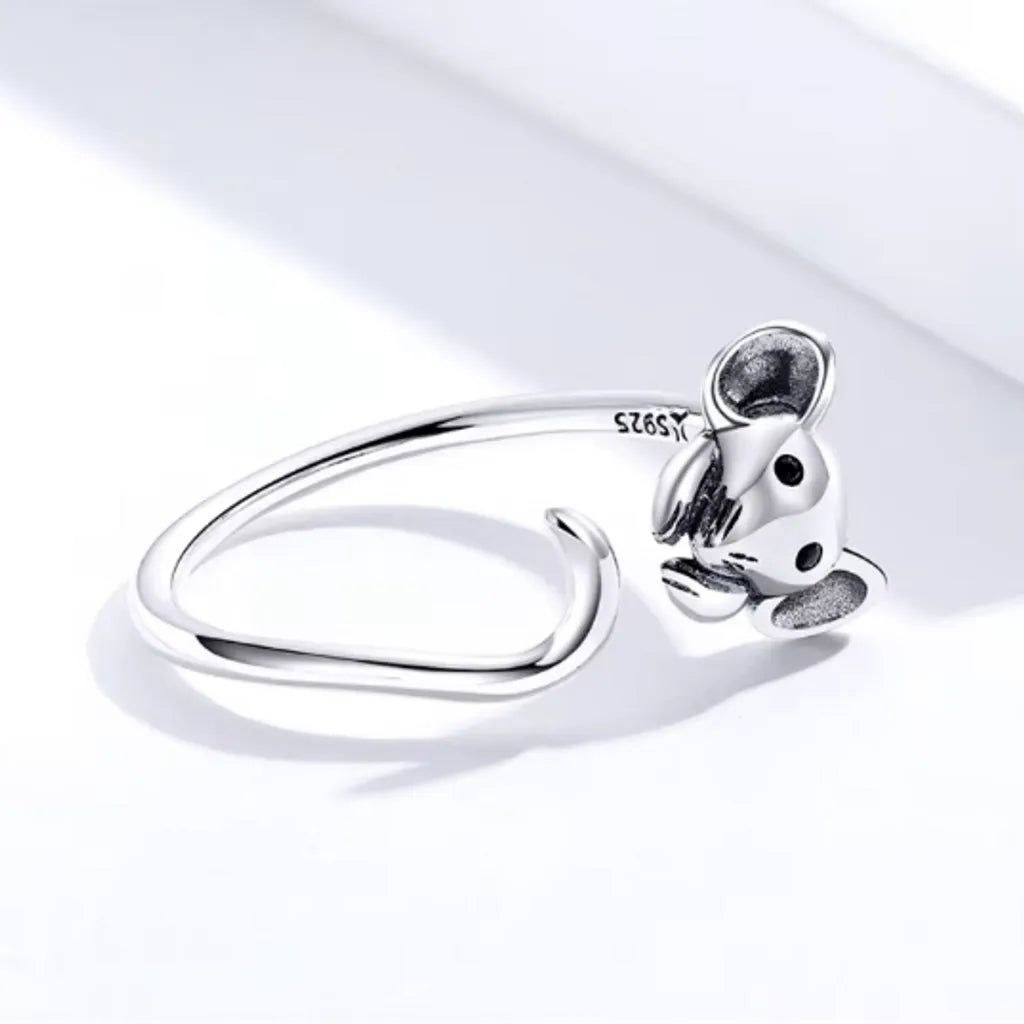 Anneau en argent motif souris blanche porté par femme, accessoire élégant et mode pour toutes occasions.