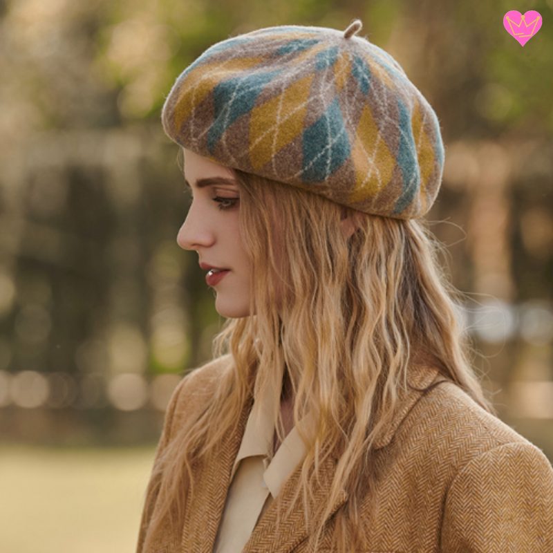 Cézanne beret, casual-chic French style for women in wool felt with plaid printed diamonds.