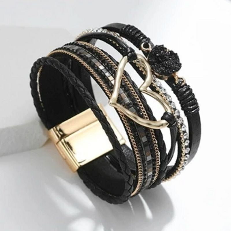 The Wandering Moon Heart Bracelet is a piece of jewelry for escape. Its multi-strand design in vegan microfiber leather offers ideal comfort, while its openwork golden heart in zinc alloy and its wandering moon charm in resin stone with a druse effect evoke a bohemian style. This bracelet is an invitation to travel, perfect for those who assert their free spirit. It goes just as well with a casual daytime look as with a bohemian chic outfit.
