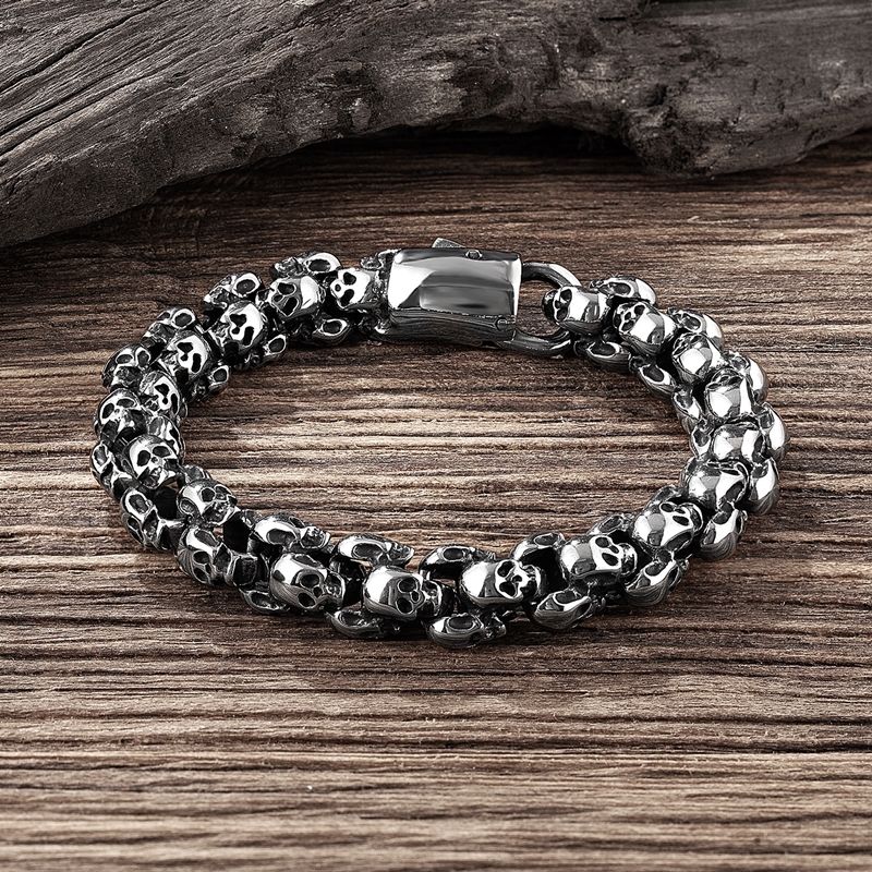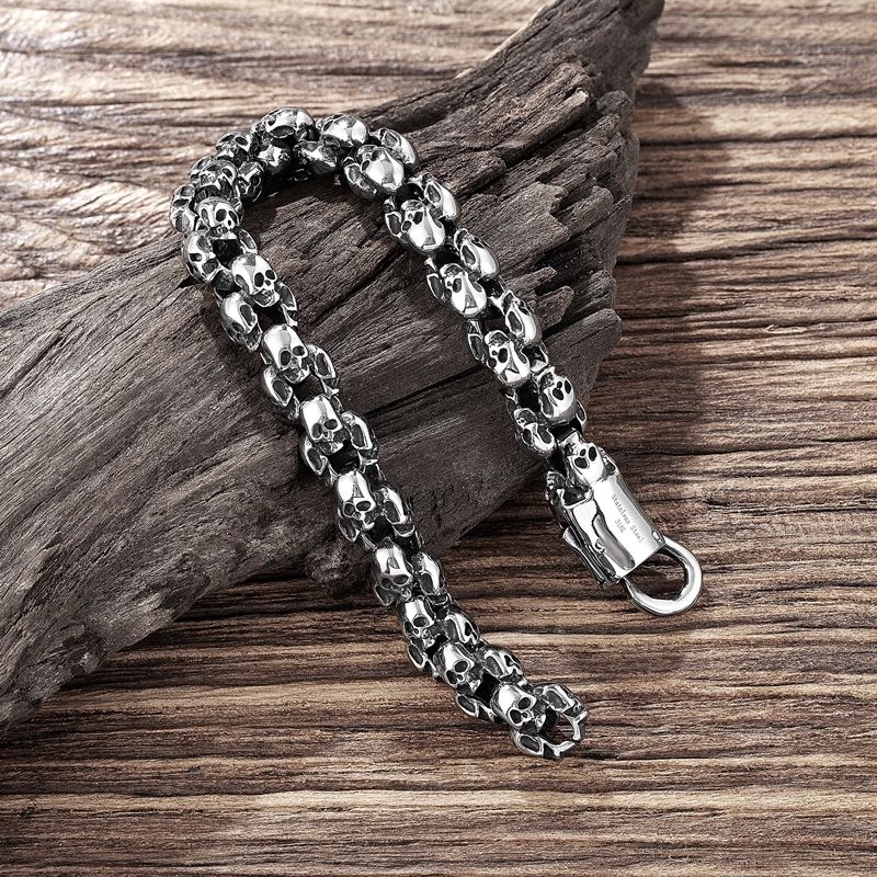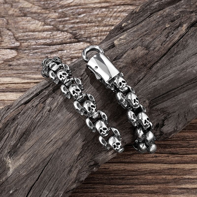 - Dive into biker style with our Stainless Steel Bracelet . Skull links, imposing and detailed, unique and quality. Sturdy hook clasp, silver color. Affirm your character with this bold accessory. Order now!