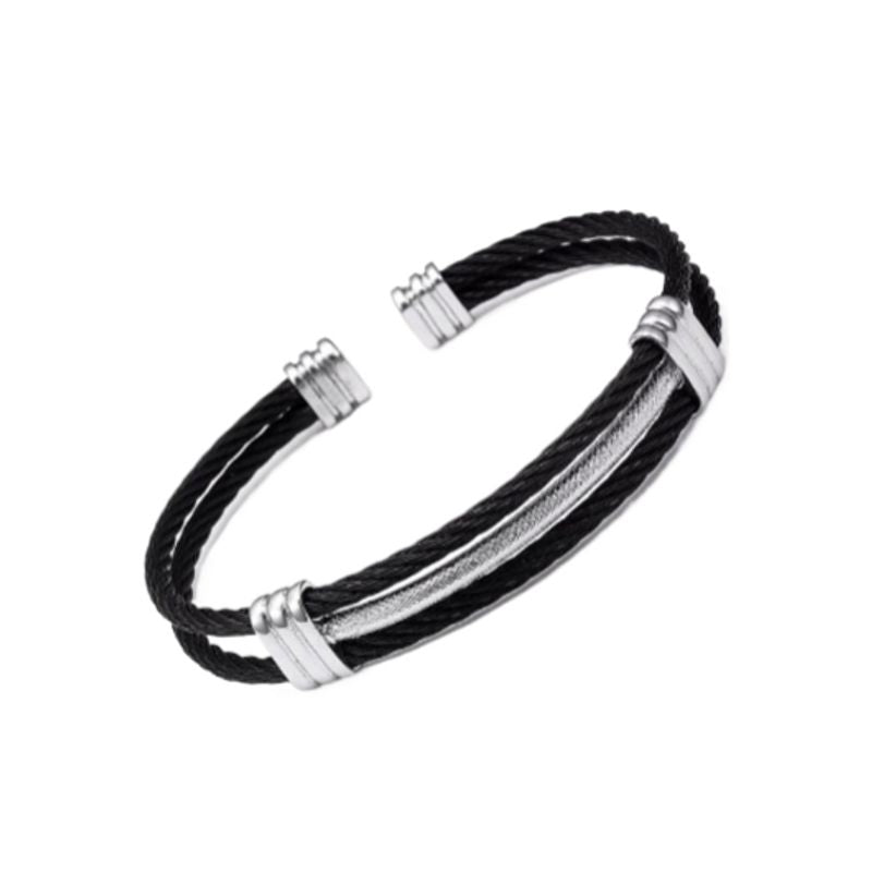 - Explore the distinctive features of the Black Braided Steel Cable Cuff Bracelet . Each twist expresses the elegance and modernity of stainless steel. The open bangle offers versatility for all wrists. Make a statement with this bold cuff. Order yours today .