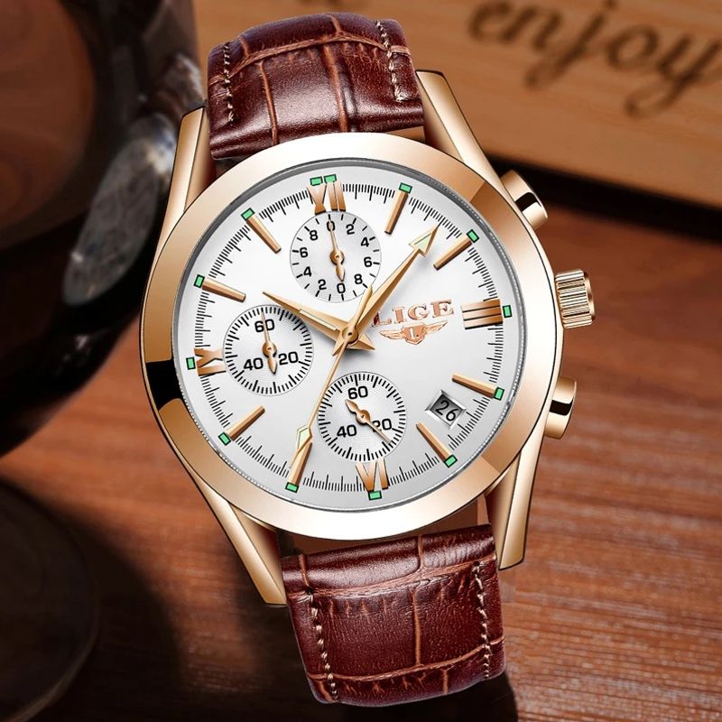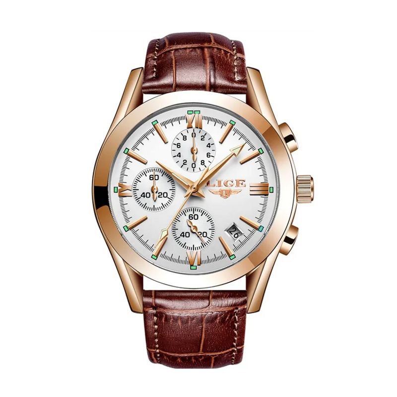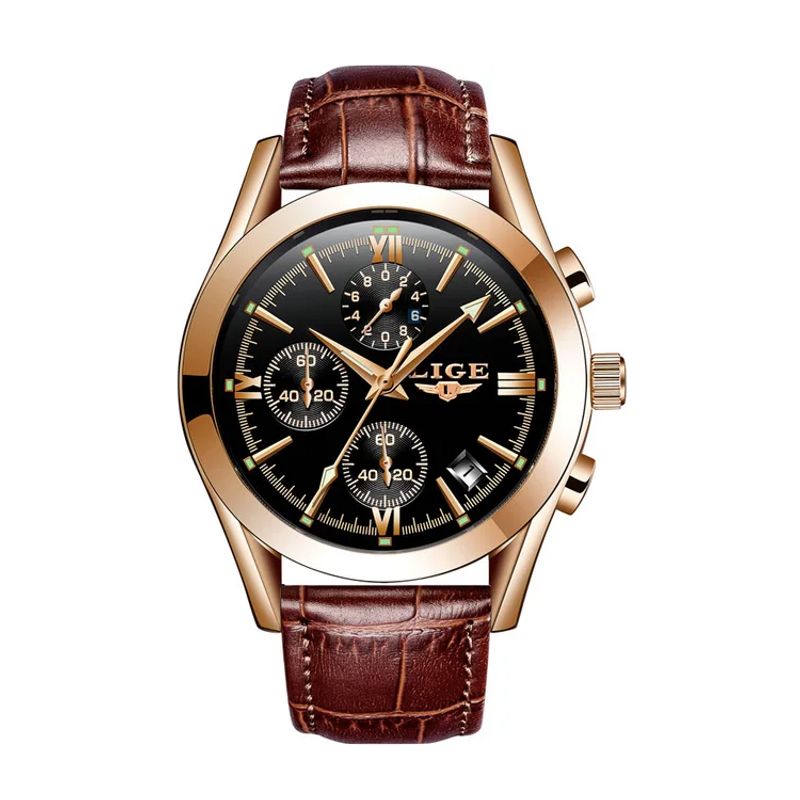 - The LIGE Chrono Style embodies elegance with its gold-tone case, hands, indexes and Roman numerals. Its brown leather strap adds a touch of refinement, while the luminescence of the hands ensures easy reading of the time, even in low light conditions. The dial, protected by Hardlex glass, ensures exceptional durability . In addition, this watch features a date display (month number) and a pin buckle clasp, combining functionality and style. Available in a limited edition, this watch is an essential addition to any collection .