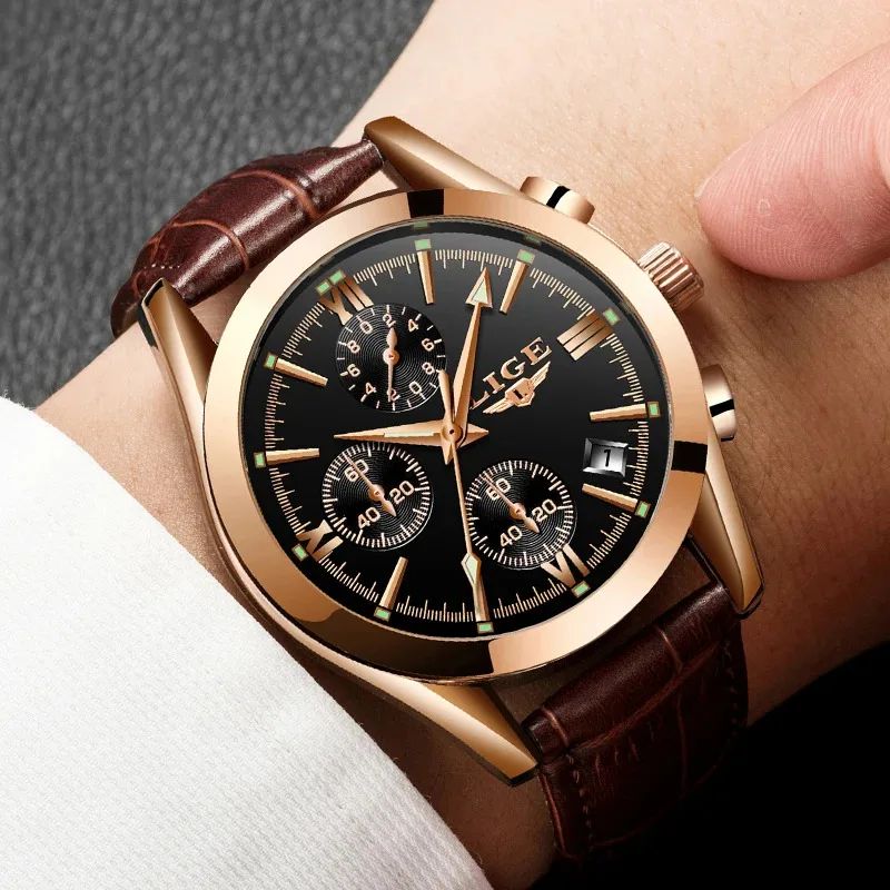 The LIGE Chrono Style for men combines sophistication and charm with its gold-tone case and brown leather strap. Equipped with a quartz movement, this watch is available with a white, black, or blue dial. A perfect choice for men looking for an elegant and distinctive accessory.