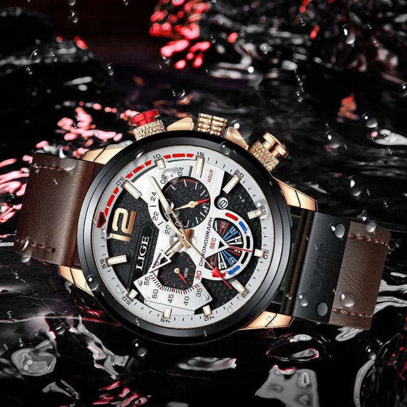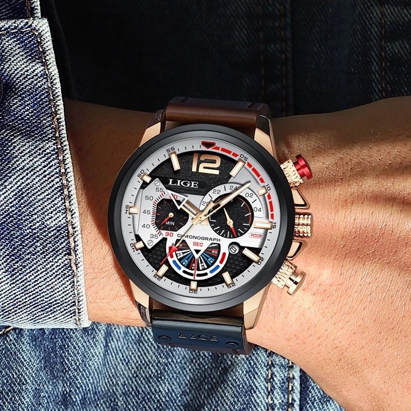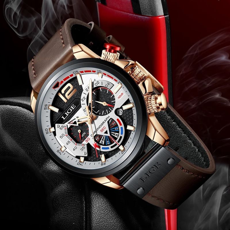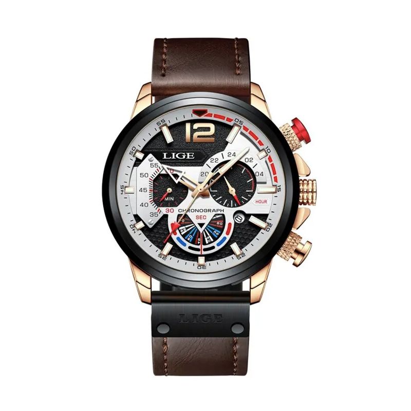 - With a gold case and a black bezel , this watch is distinguished by its stick indexes and hands: the hour hand in the shape of a golden arrow, the minute hand in the shape of a point, and the second hand with a red tip. The brown leather strap with stitching and a plaque engraved with the LIGE logo, combined with a matte black steel pin buckle, offers comfort and durability.