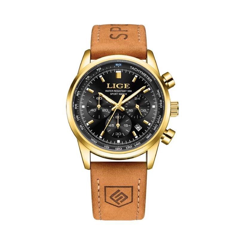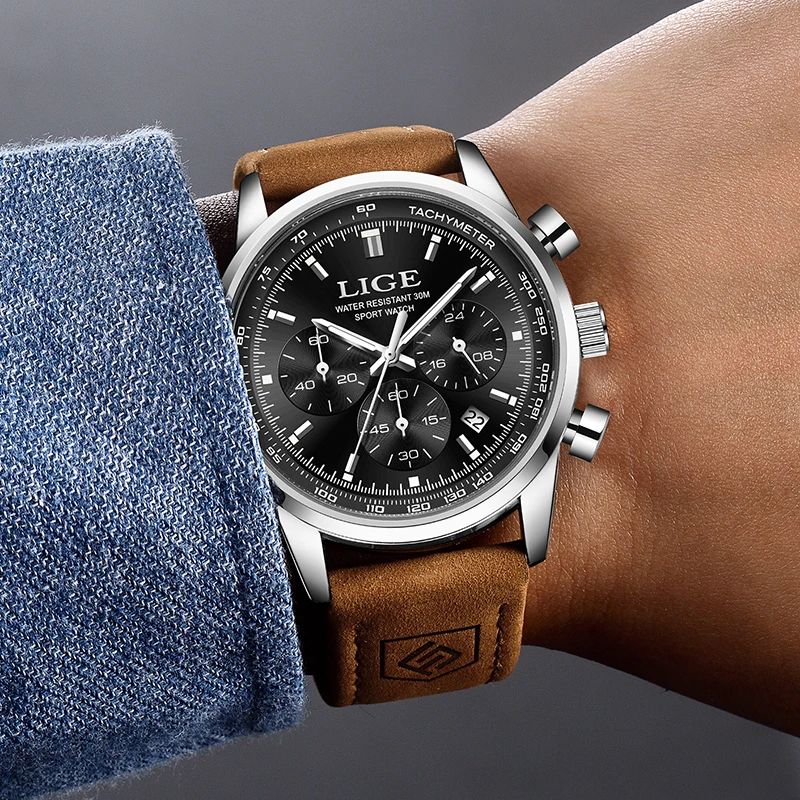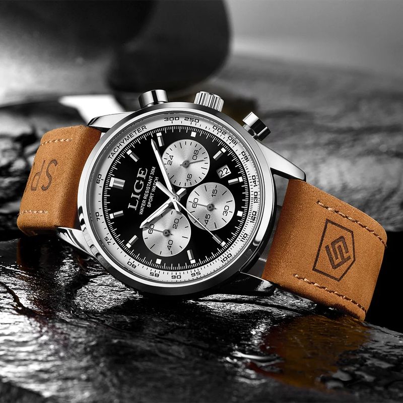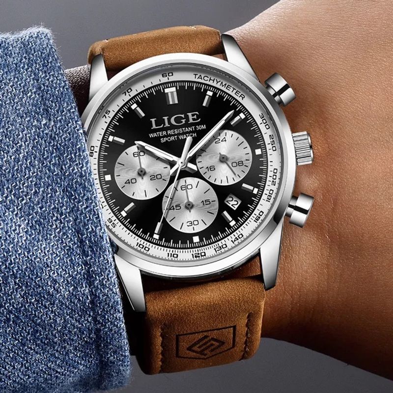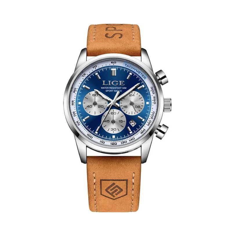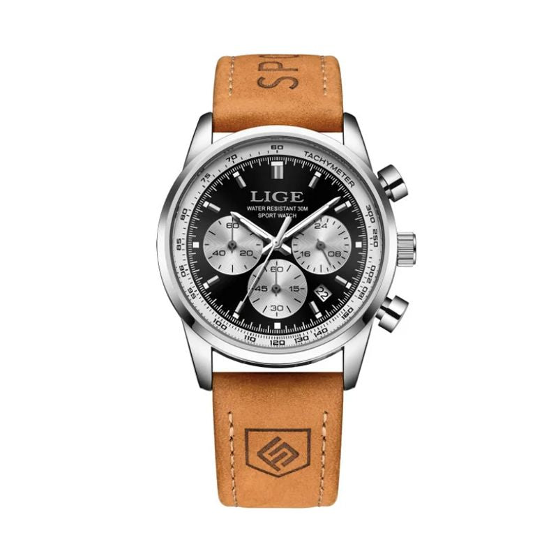 - The LIGE Sport Chrono men's watch embodies a sporty and elegant look with its pumpkin brown leather strap and distinctive stitching. Equipped with a quartz movement, this chronograph watch is designed for active men who value style and functionality.