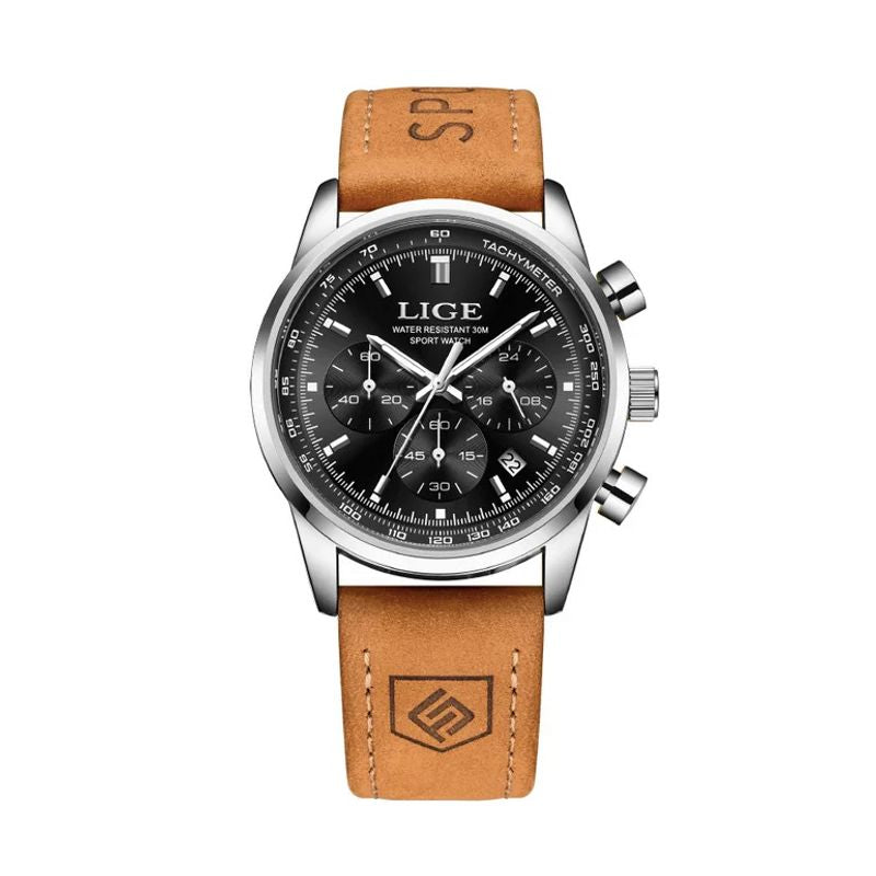 - The LIGE Sport Chrono is distinguished by its robust case and pumpkin brown leather strap, combining durability and style . This chronograph watch features three subdials: a real 24-hour indicator, a stopwatch minute counter, and a stopwatch second counter. The indexes, second hand, and date add to its sporty and functional look. The dial, protected by Hardlex glass, ensures increased scratch resistance . The pin buckle ensures a secure and comfortable fit. Available in five colorways, this watch is a must-have for those seeking a perfect combination of performance and sporty elegance .