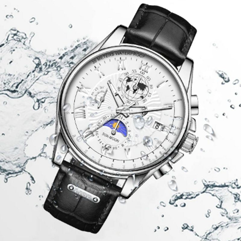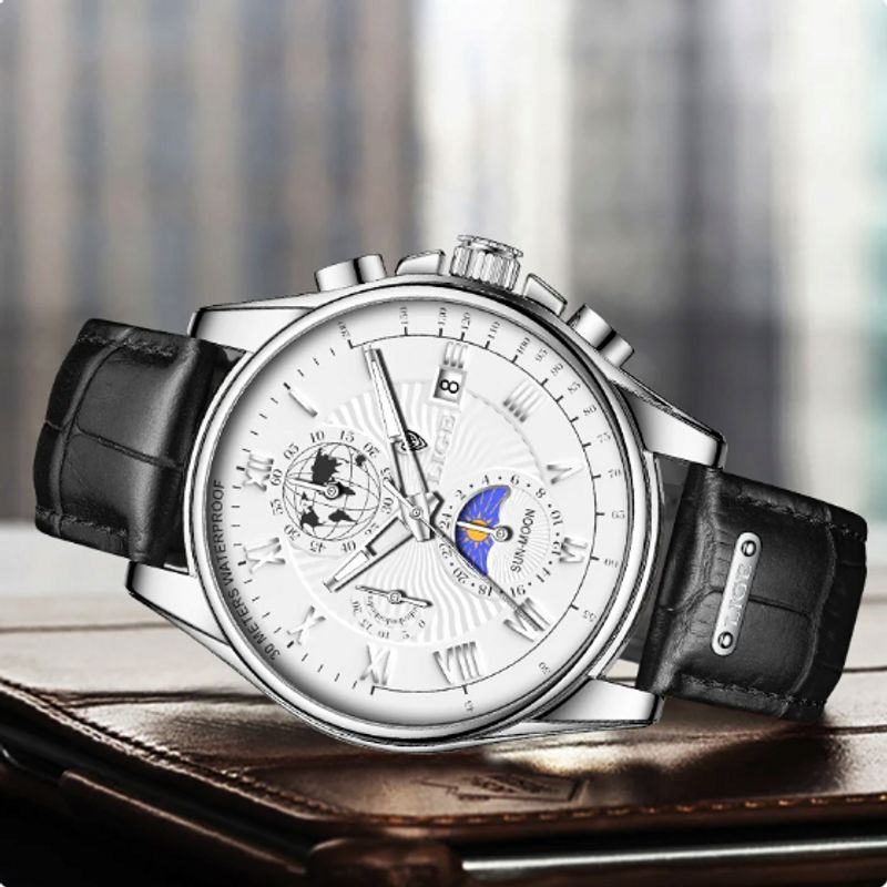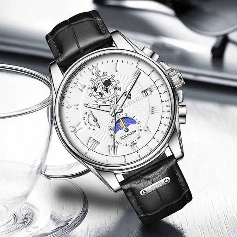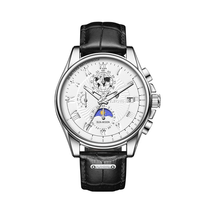 - The LIGE Urban Chrono combines sophistication and performance for the modern man . Equipped with three sub-dials (second, 1/1000 second, moon phase) and a calendar, this watch offers reliable precision and practical features . All protected by a durable Hardlex glass, ensuring optimum scratch resistance. Its black leather strap adds a touch of class, making this watch the ideal choice for an elegant and versatile look .