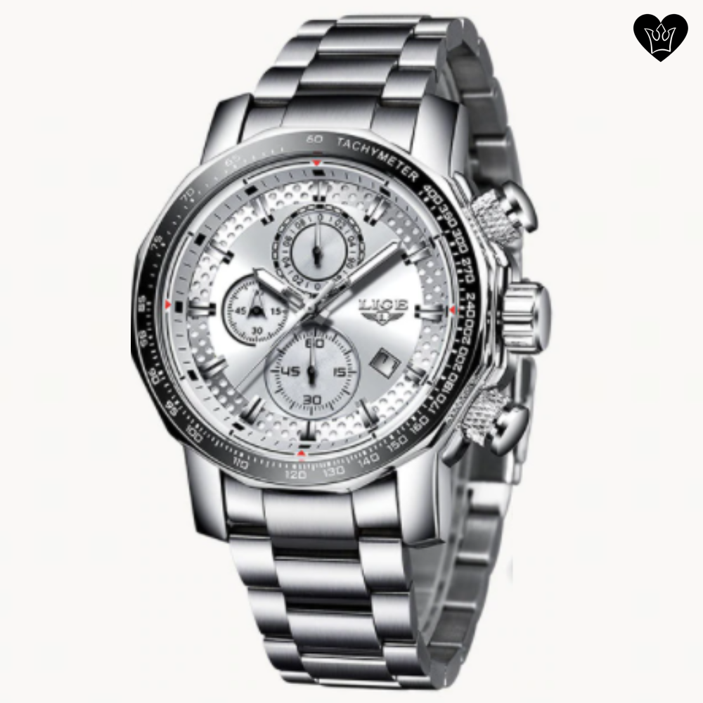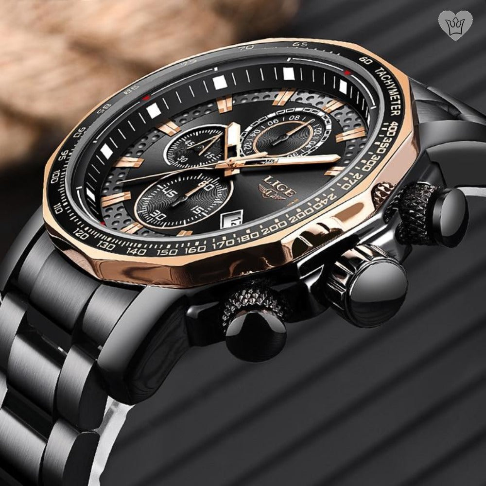 LIGE men's watch with tachymeter and chronograph, luxury sports fashion in surgical steel with HQ quartz movement and folding clasp bracelet.