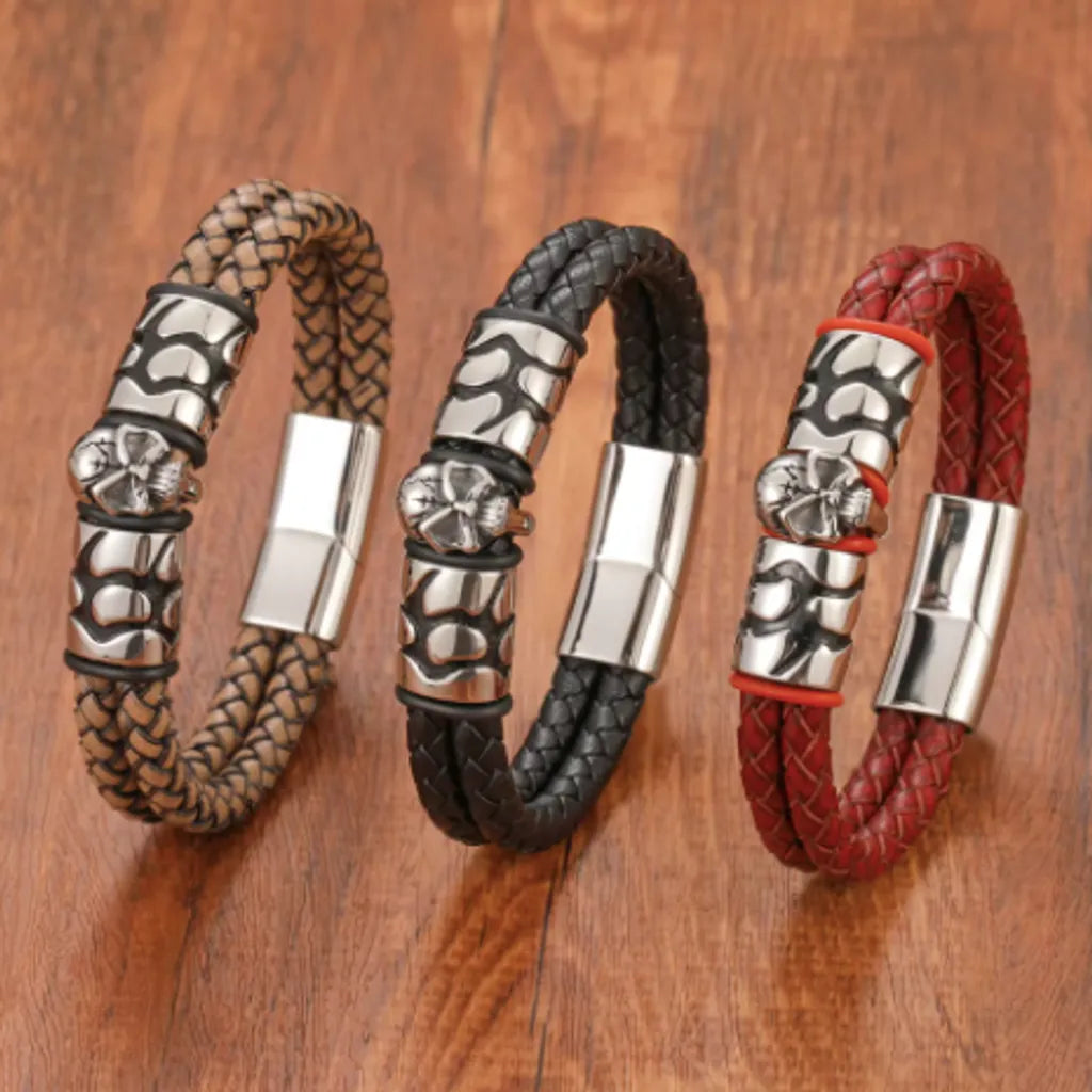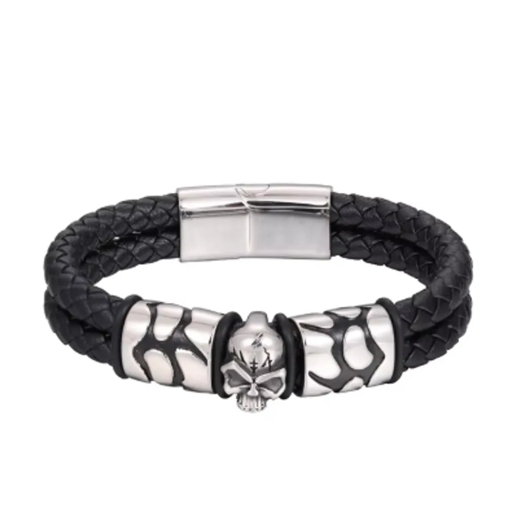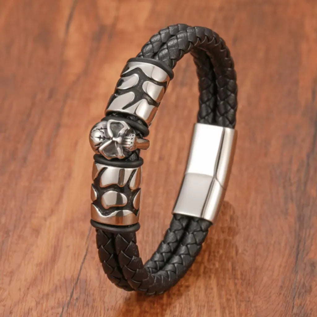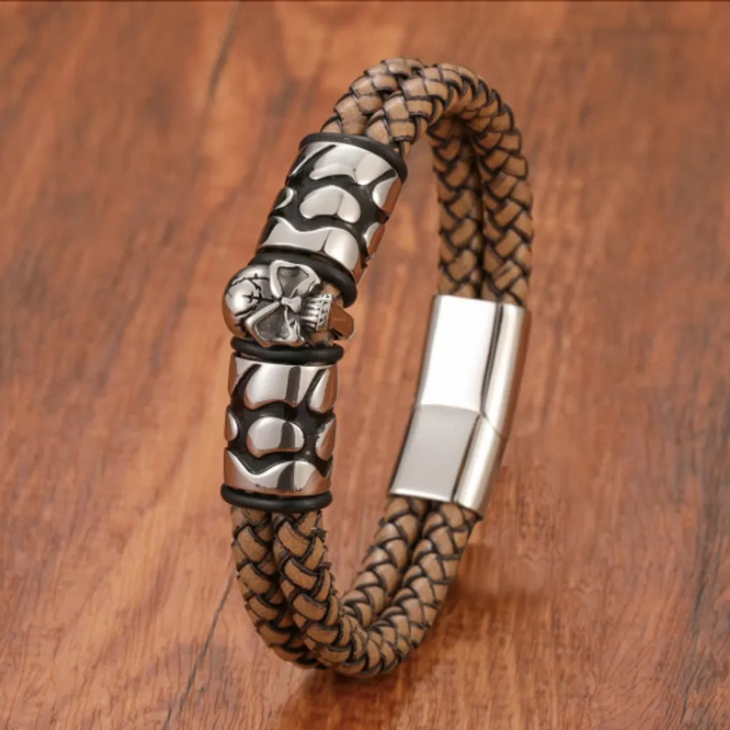Embrace a bold look with this braided leather bracelet adorned with a steel-engraved skull charm. Available in three elegant colors and featuring a silver-tone magnetic clasp, this piece is an ideal choice for the modern man.