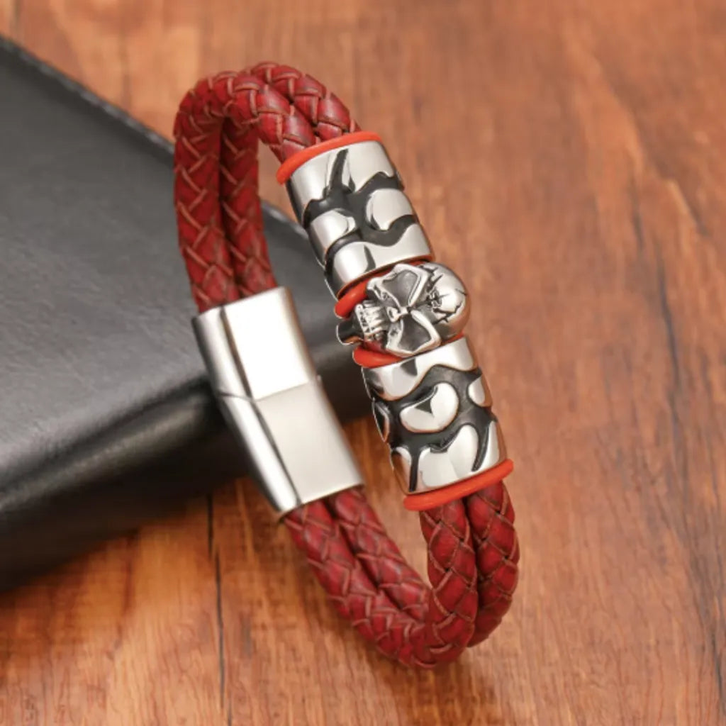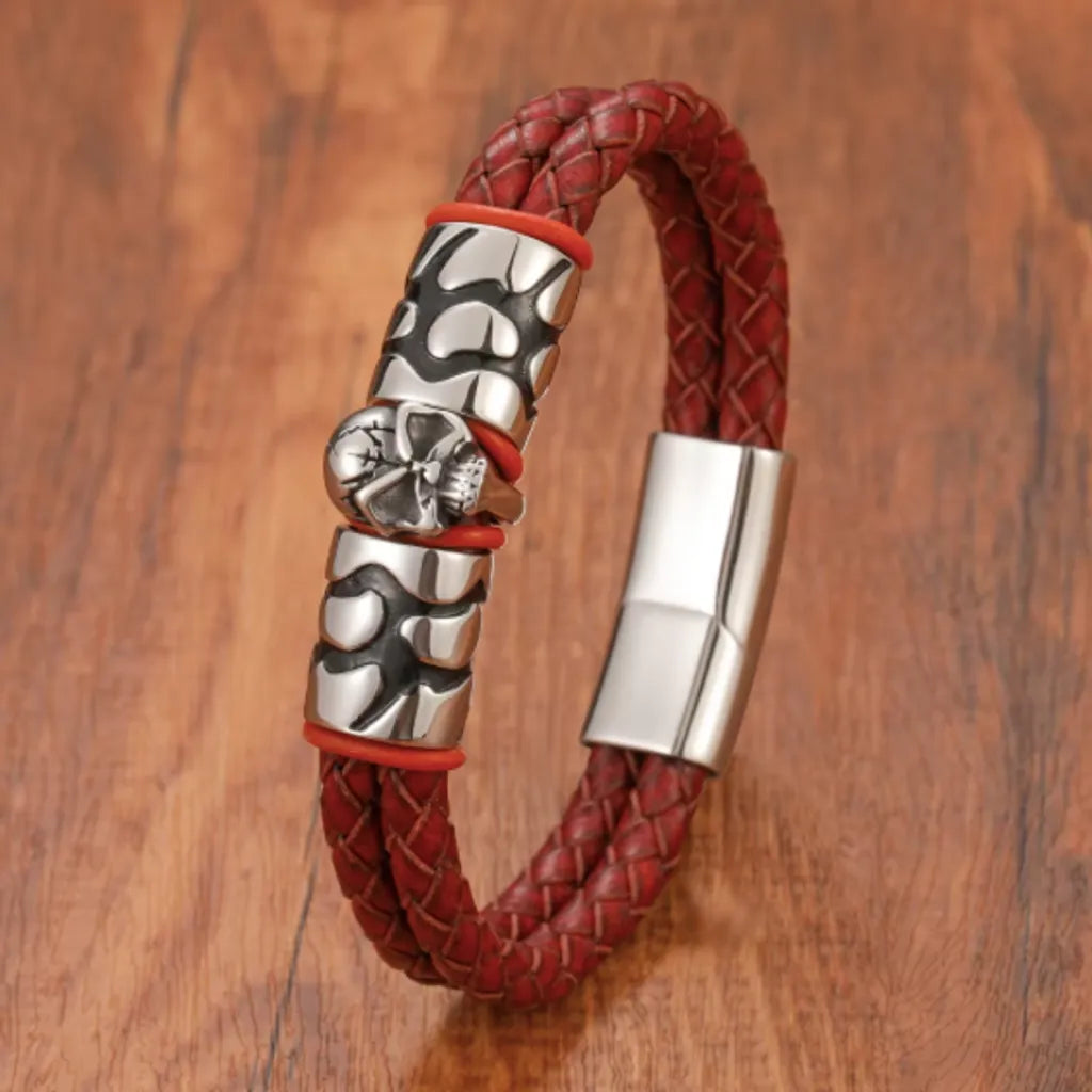 This bracelet features two round, finely braided genuine leather straps for a sophisticated yet rugged look. The stainless steel skull charm features intricately engraved abstract patterns, adding a unique and artistic touch. Available in black, beige, and red, it complements any style, from classic to bold.