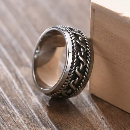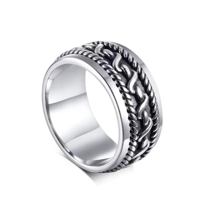Inspirado en el entrelazado de la mitología nórdica , el anillo Skadi despliega su textura retorcida como un alambre de acero domado por el fuego. Cada detalle parece grabado en el propio material, evocando las cadenas del destino y el poder sereno de quienes avanzan sin titubear. Con 9 mm de ancho, no solo adorna la mano: impone estilo, presencia.