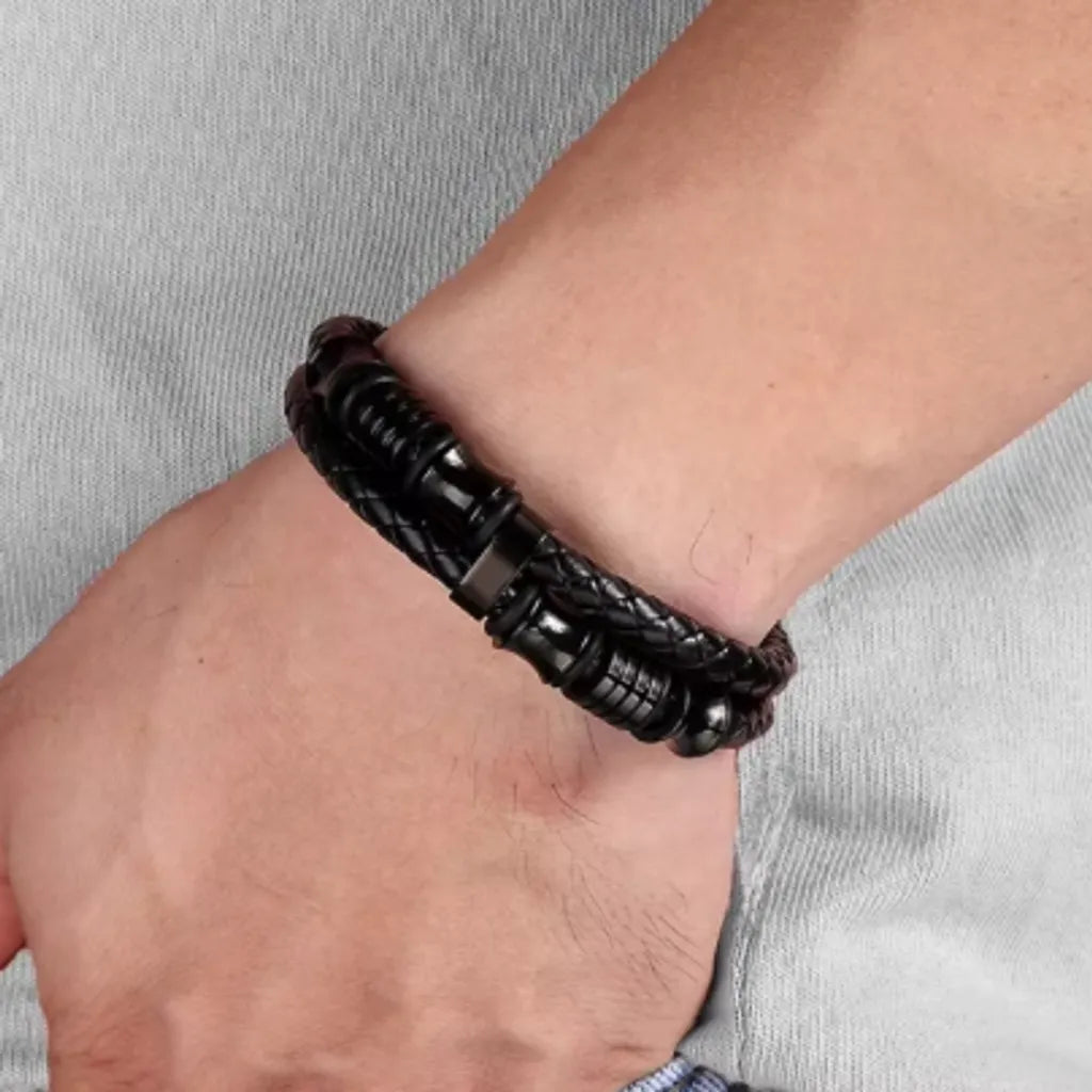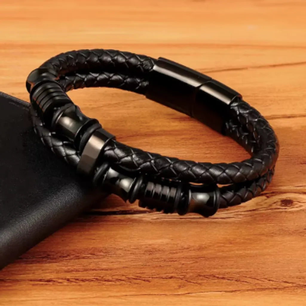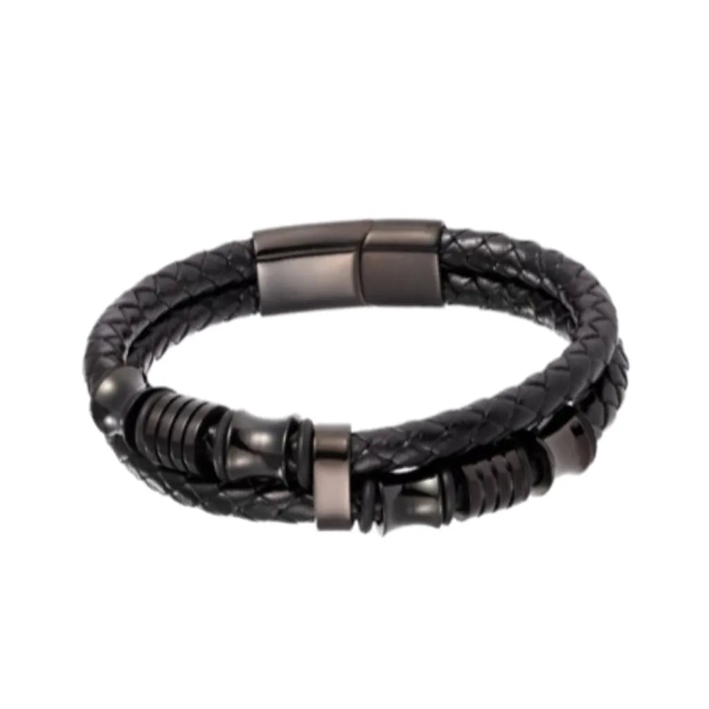 ✔️ Cuir noir tressé équilibré par la géométrie précise des six perles en acier.