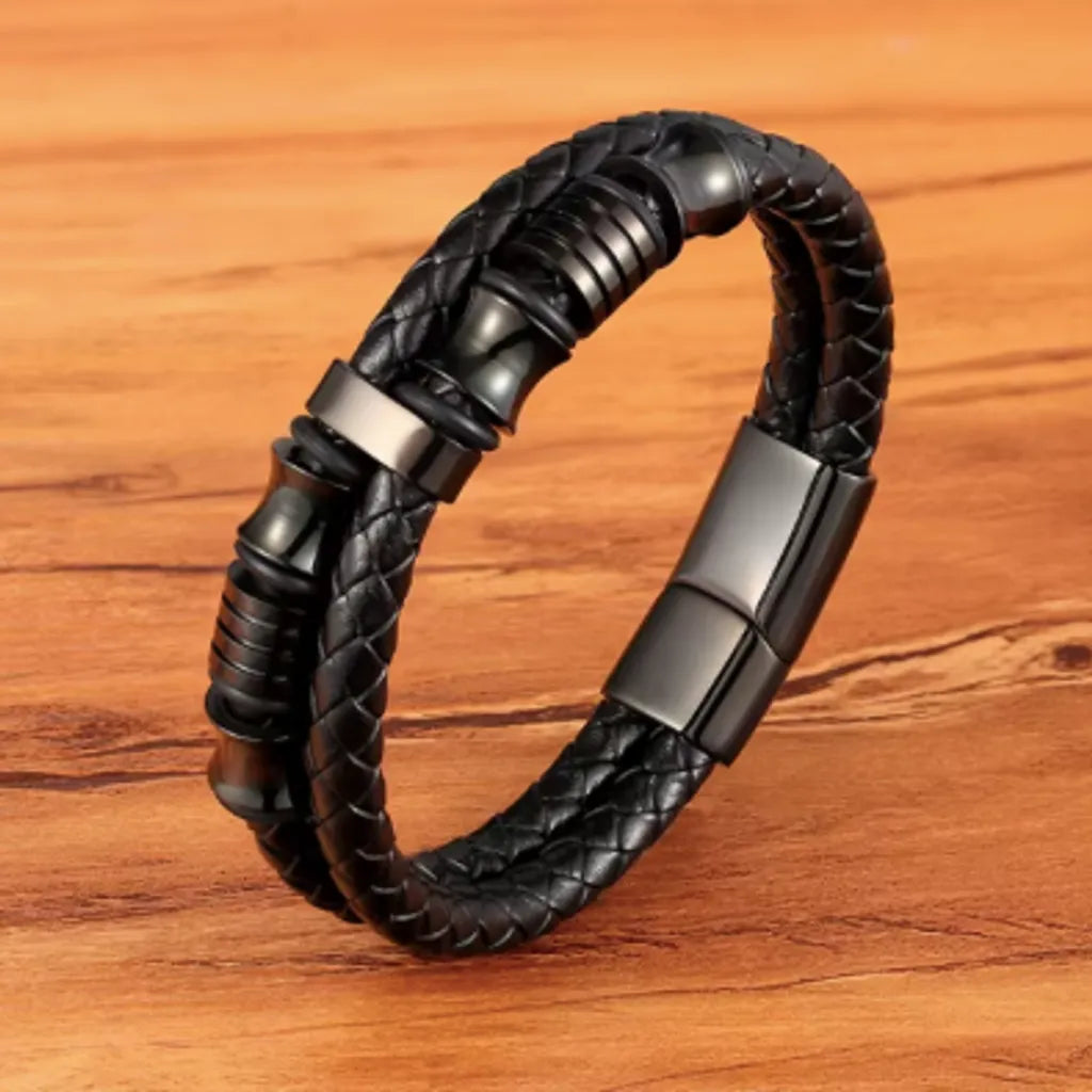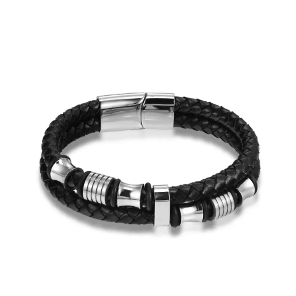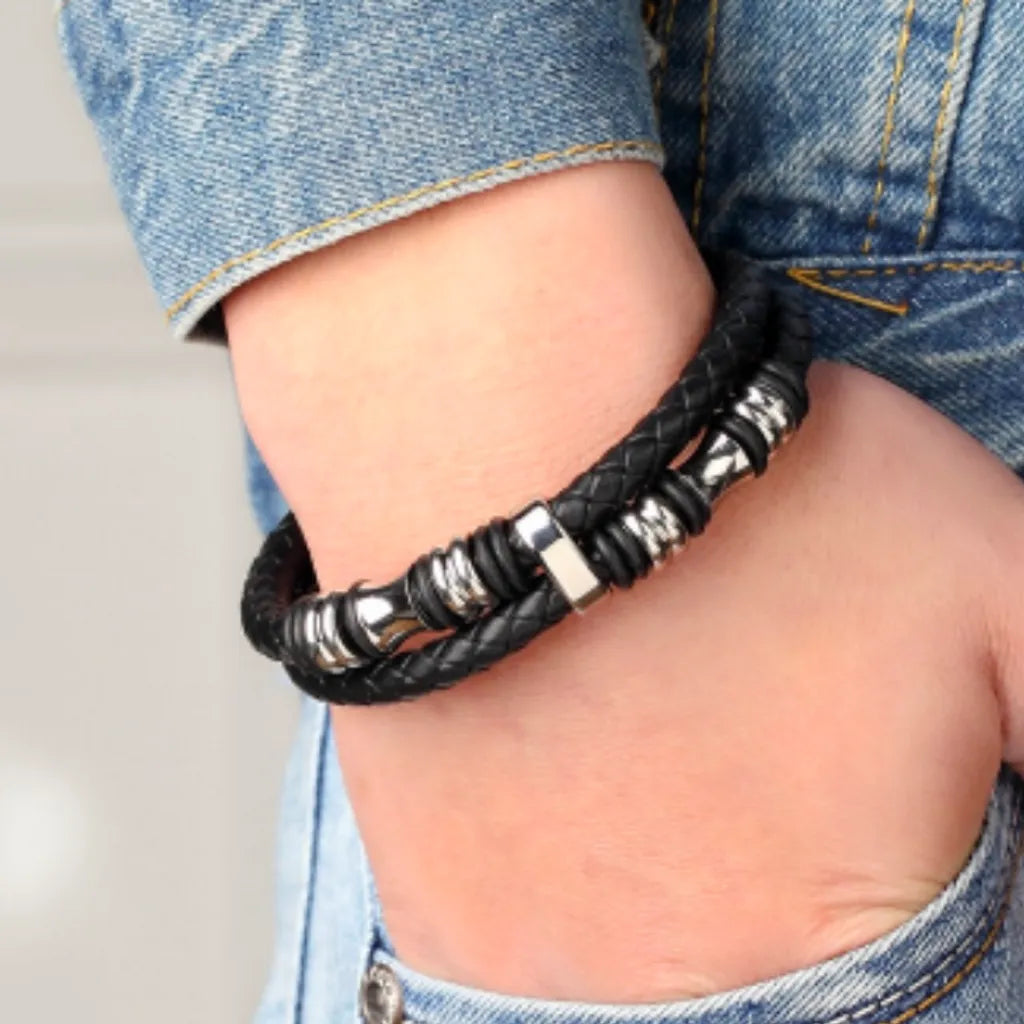 ✔️ Cuir noir tressé équilibré par la géométrie précise des six perles en acier.