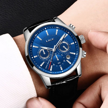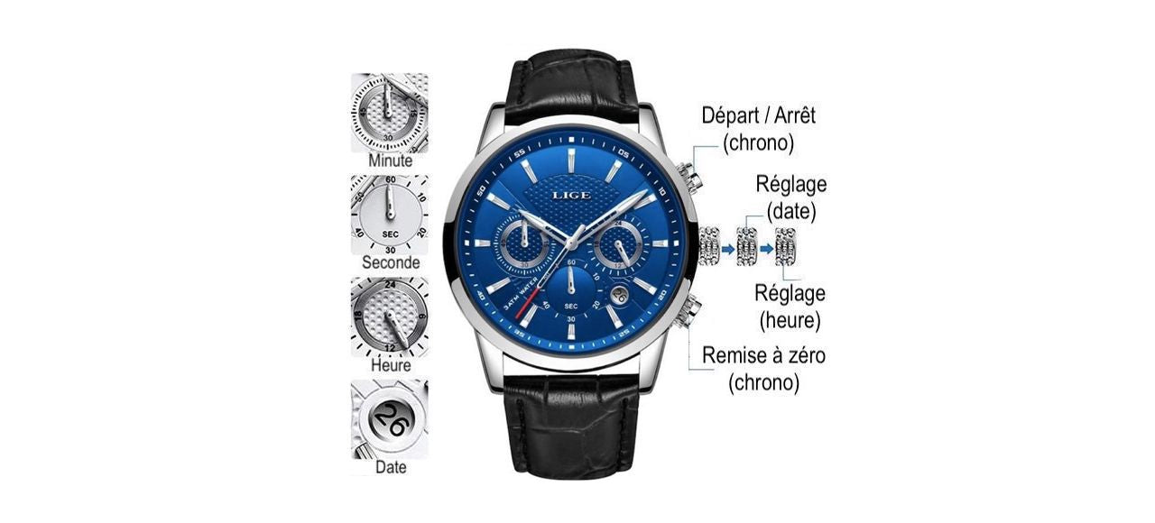 - Découvrez la LIGE Chrono Markus, une montre chronographe sport aux finitions soignées et aux performances remarquables. Mouvement à quartz, trois sous-cadrans pour le chronomètre, un calendrier jour, cette montre au bracelet cuir noir est conçue pour les hommes actifs. Disponible avec un cadran bleu ou noir.