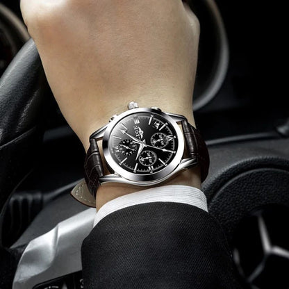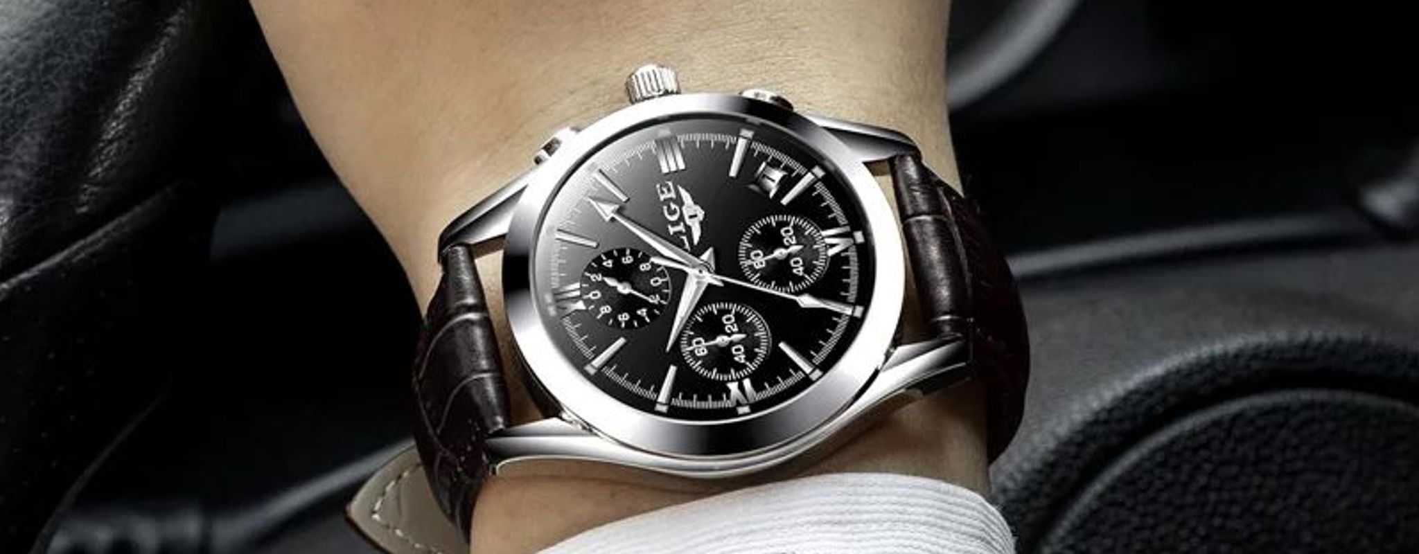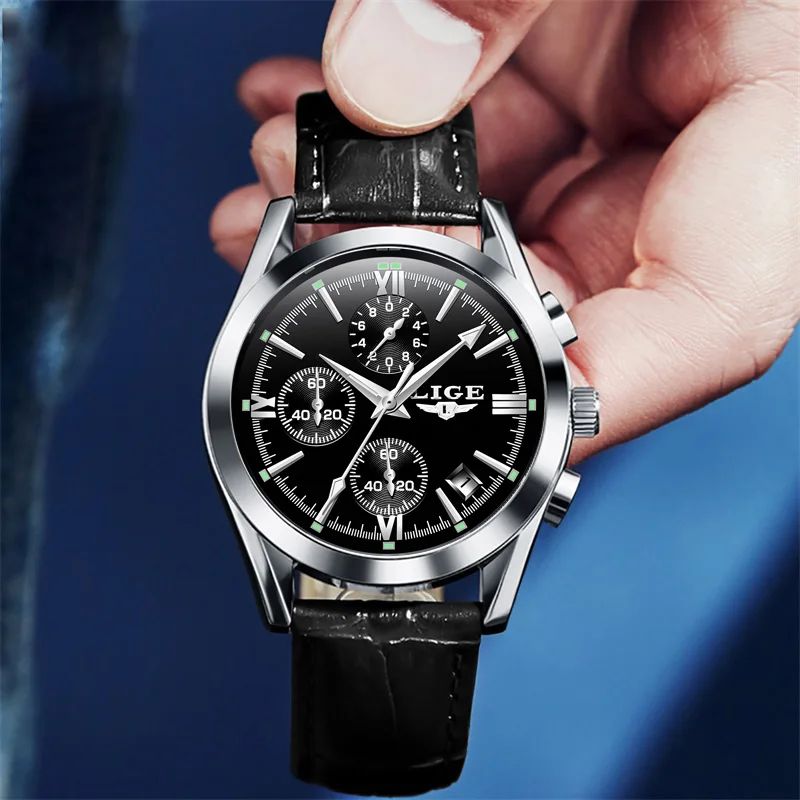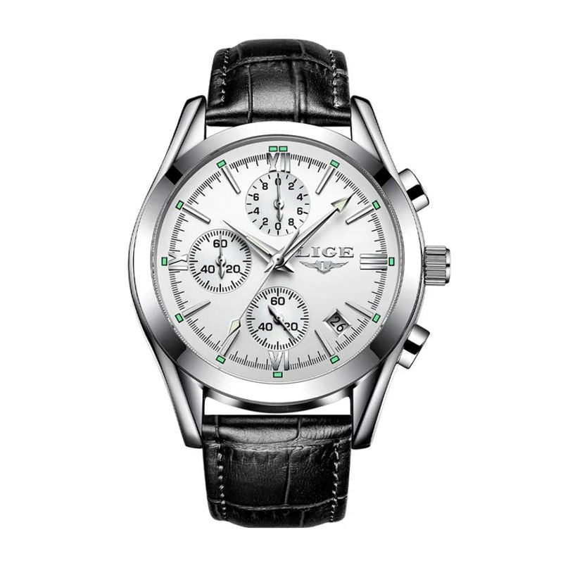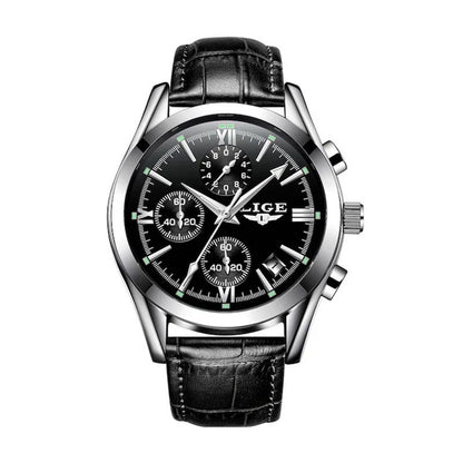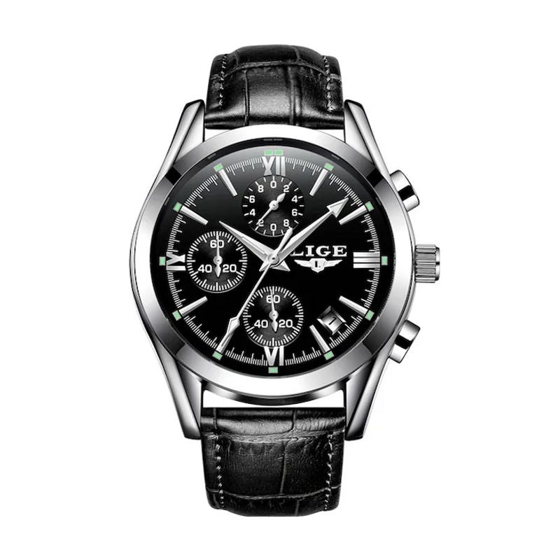 LIGE Chrono Style - Montre Homme Boîtier Argent Bracelet Cuir Noir