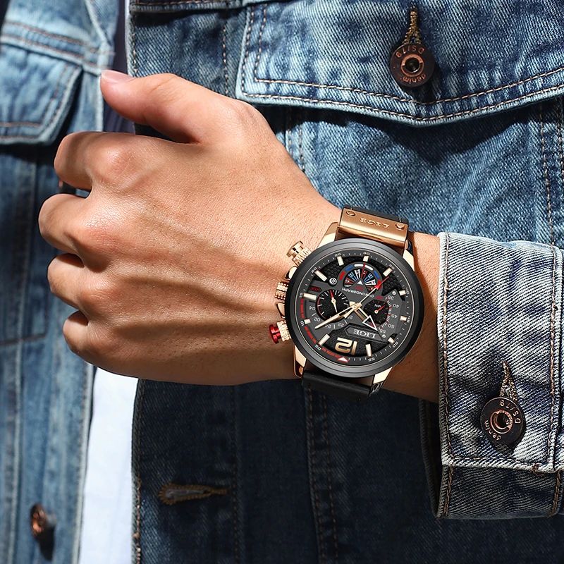 LIGE Chrono Markus - Montre Homme Sport Bracelet Cuir Marron