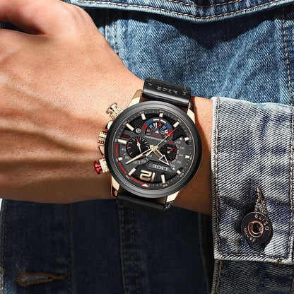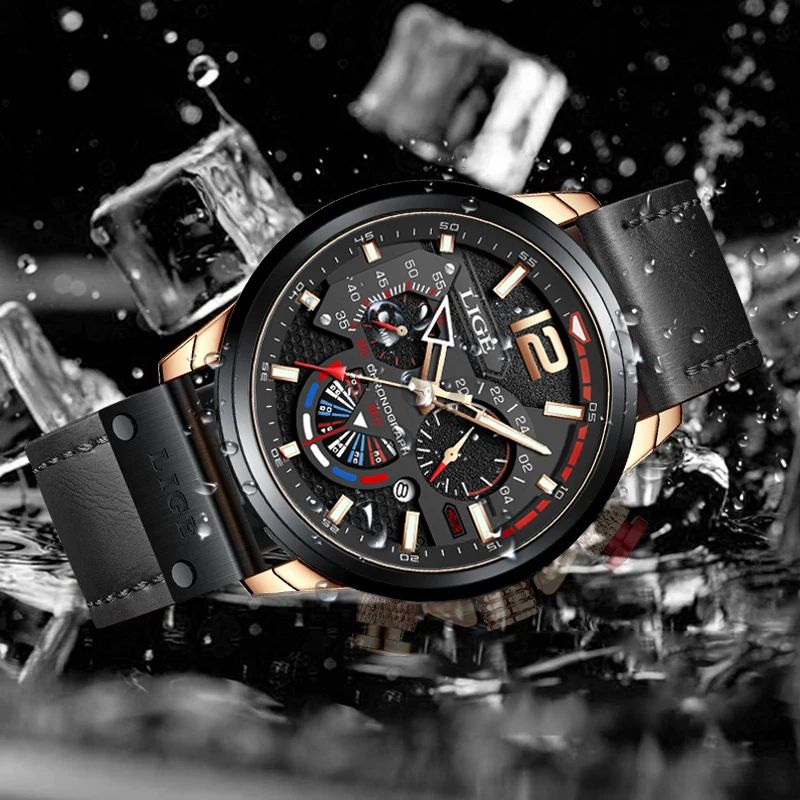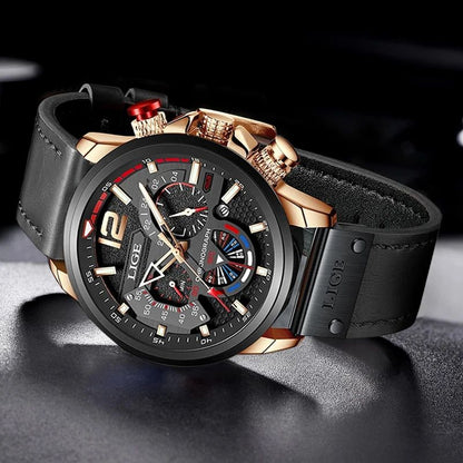 LIGE Chrono Markus - Montre Homme Sport Bracelet Cuir Noir