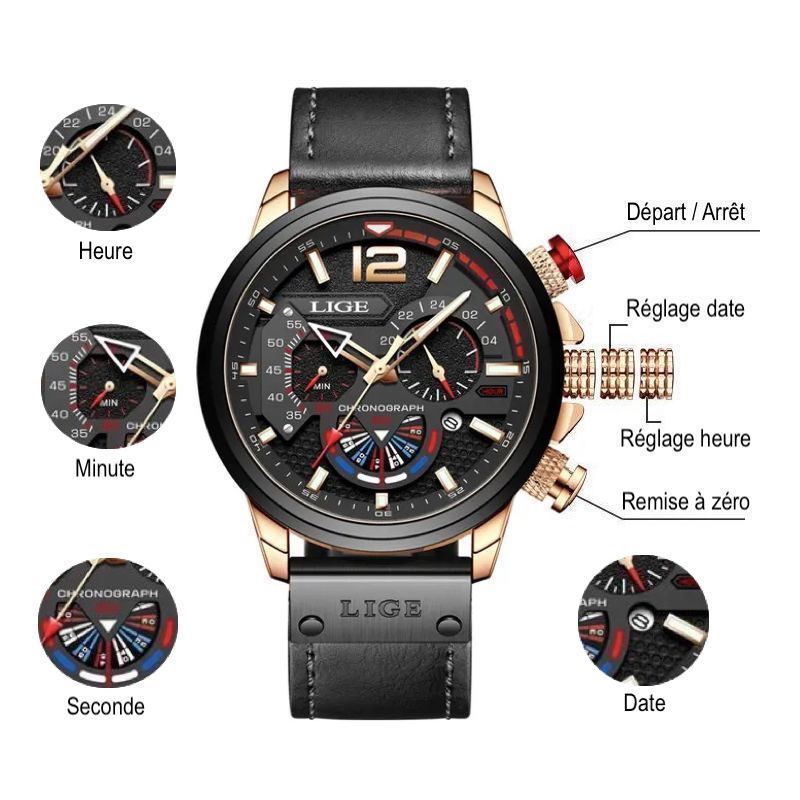 - Le boîtier or ou argent contraste parfaitement avec les index en forme de bâton et les aiguilles dorées ou argentées : l'aiguille des heures en forme de flèche, celle des minutes en pointe, et celle des secondes avec une extrémité rouge. Le bracelet en cuir noir, orné d'une plaque gravée du logo LIGE, et la boucle ardillon en acier, assurent un confort optimal et une durabilité à toute épreuve.