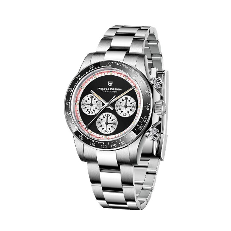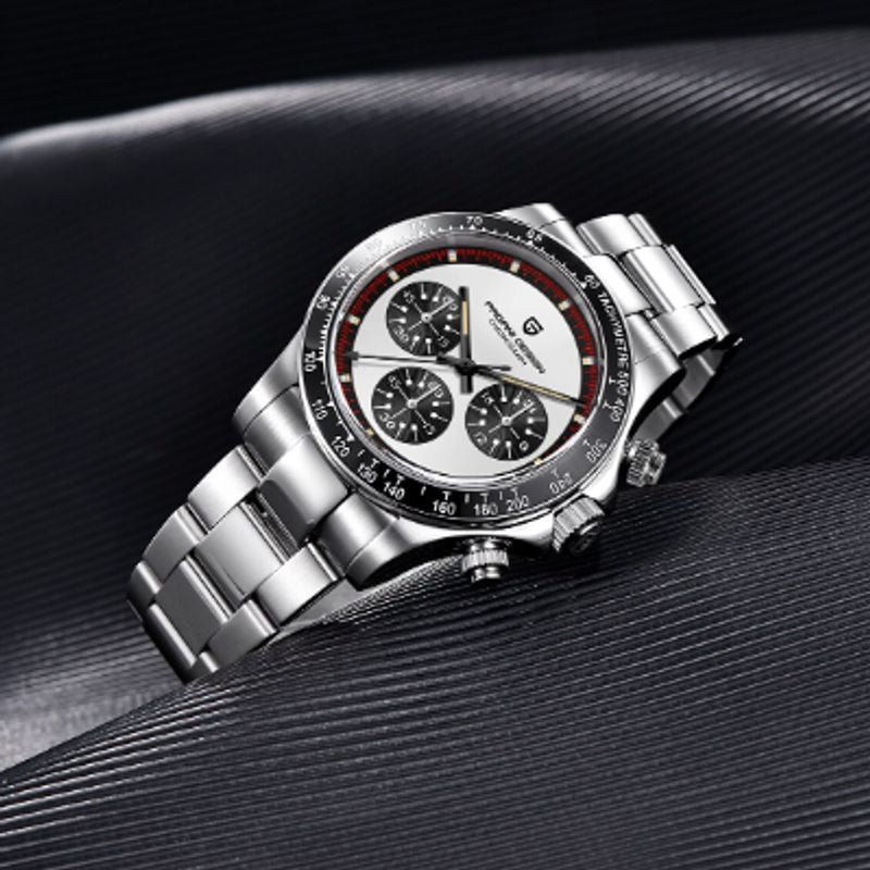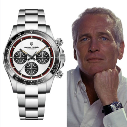 - La montre Hommage à la Daytona Paul Newman capture l'essence de la course automobile. Dotée d'un mouvement chronographe mécanique hybride à quartz de précision, cette montre est conçue pour les amateurs de vitesse et de performance. La couronne vissée assure une étanchéité à toute épreuve, tandis que la lunette en céramique et le verre saphir résistant aux rayures garantissent une durabilité exceptionnelle.