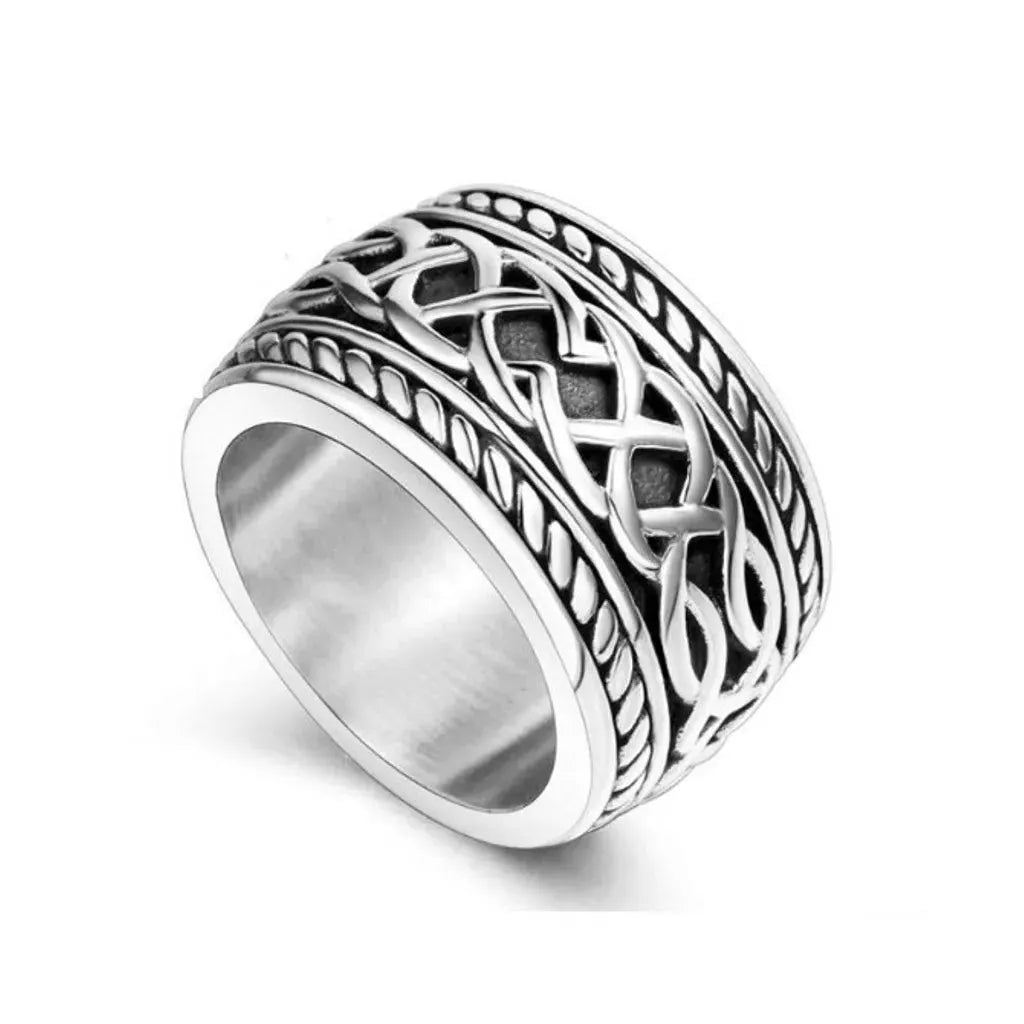 Massive et expressive, la bague Celte Dagan en acier inoxydable arbore un large nœud celtique entrelacé.