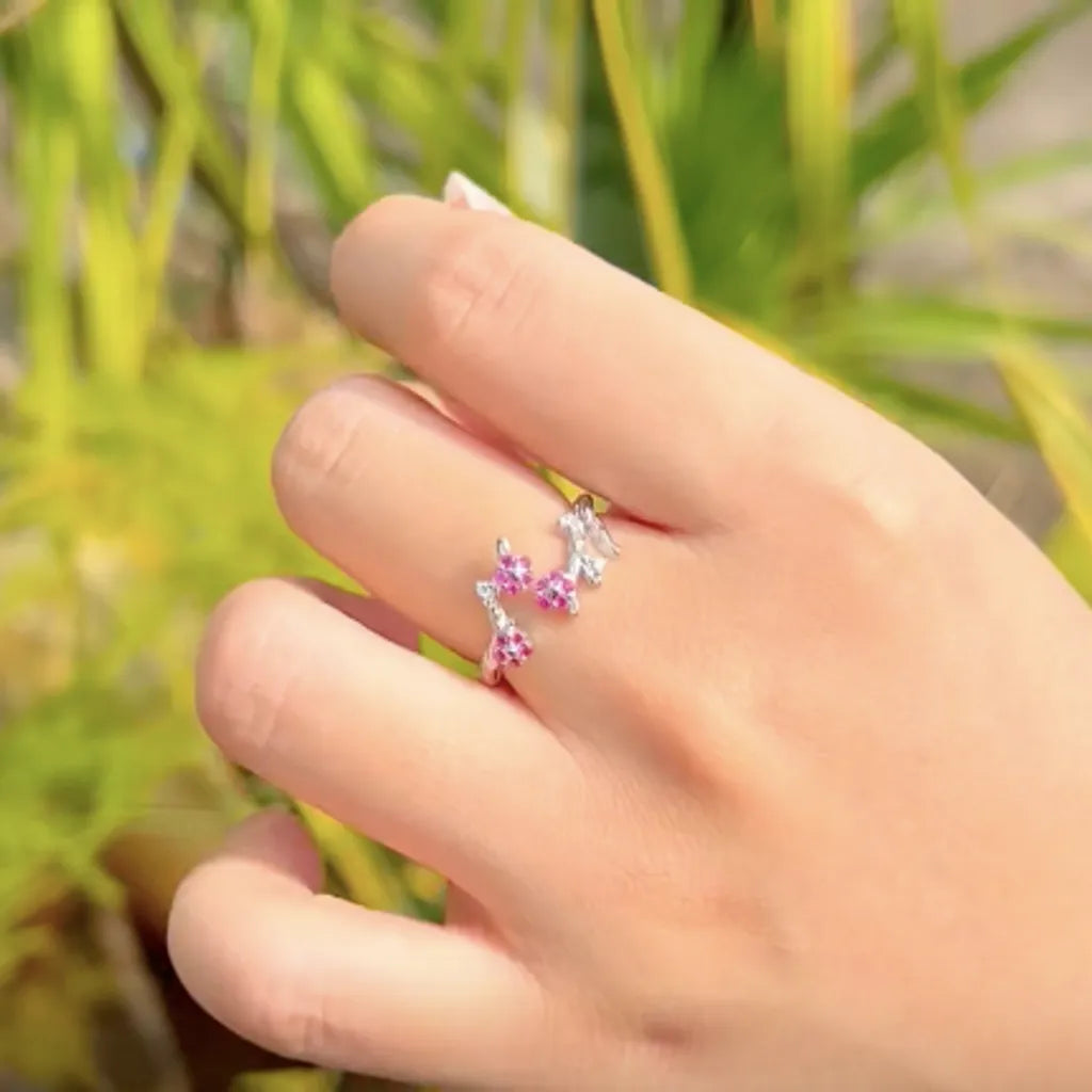 Une bague ouverte au motif floral qui évoque la grâce du prunier japonais. Ses zircones roses scintillantes illuminent chaque geste avec douceur.
