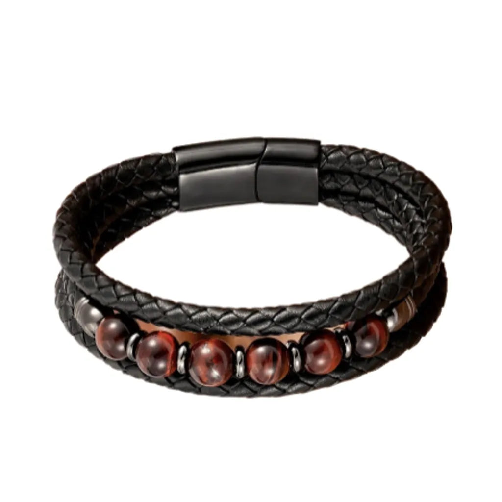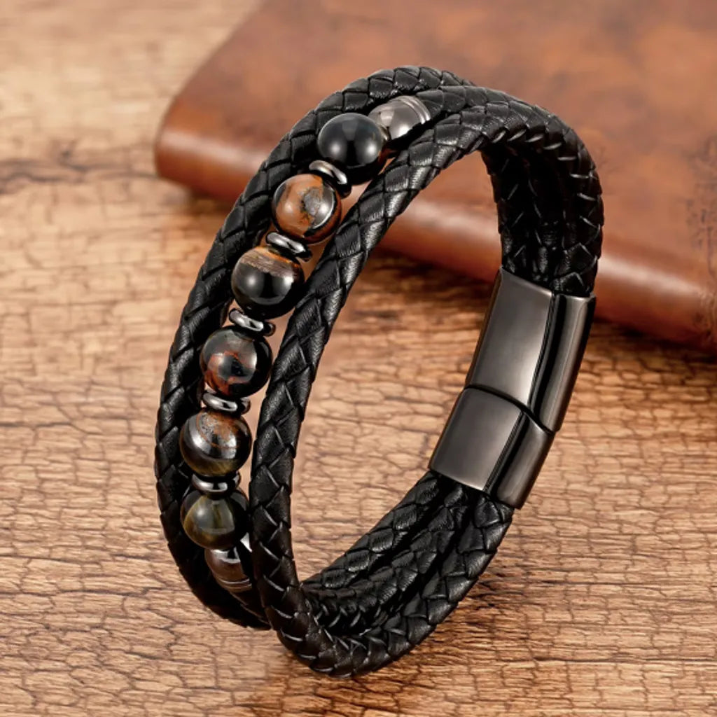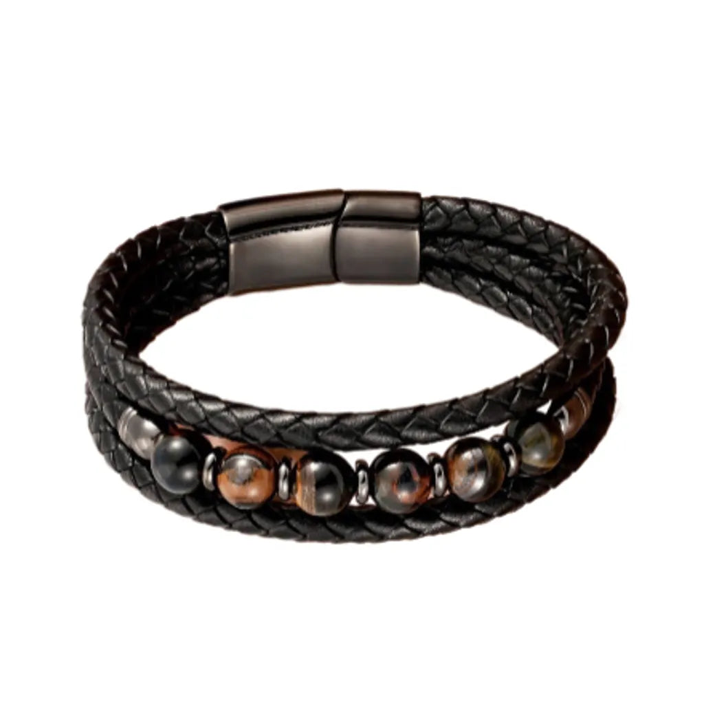 Bracelet Talis en Cuir Tressé Noir Multi-rangs - Perle Œil de Tigre