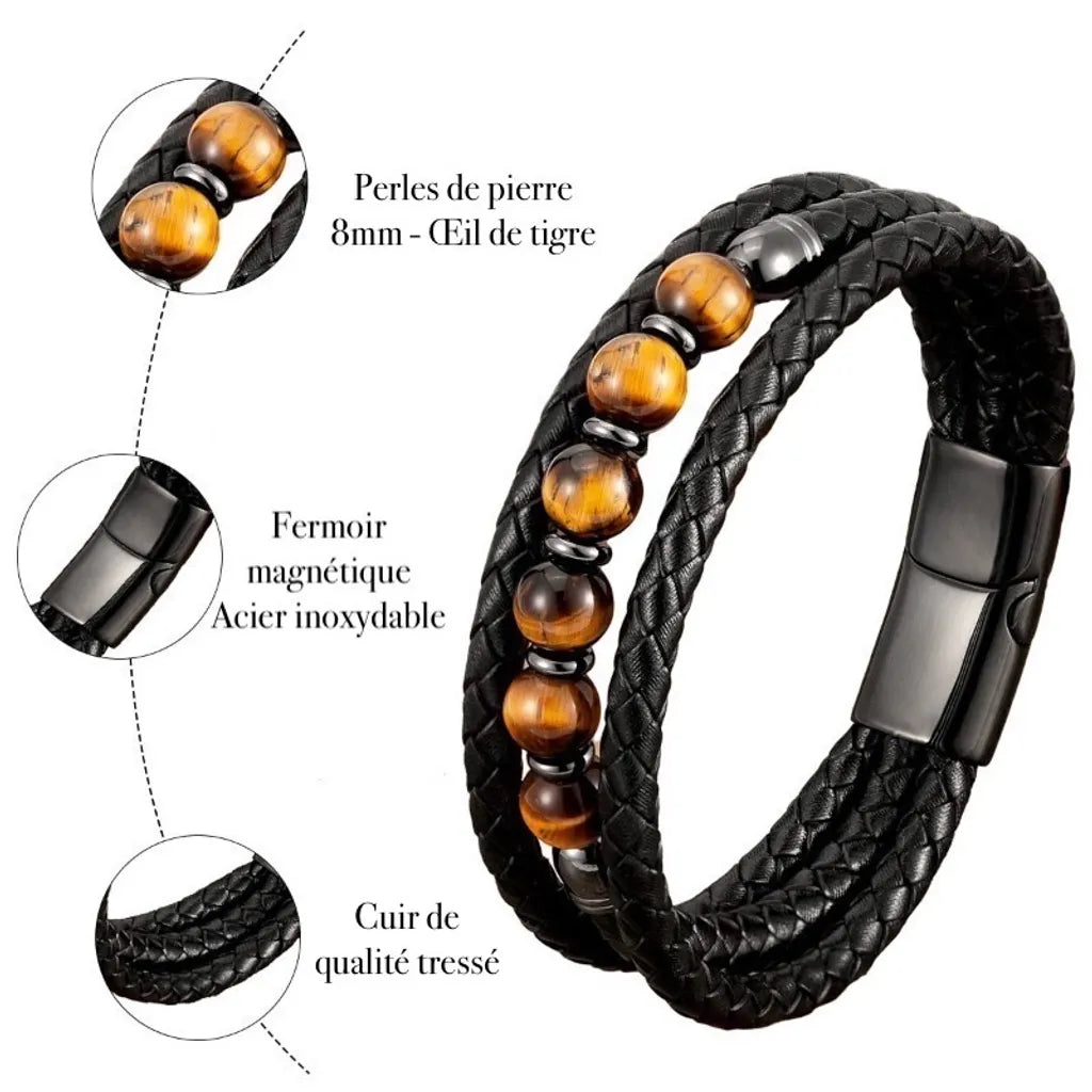Spécificité : Multi-rangs (triple lanière tressée), perles œil de tigre alignées (6)
